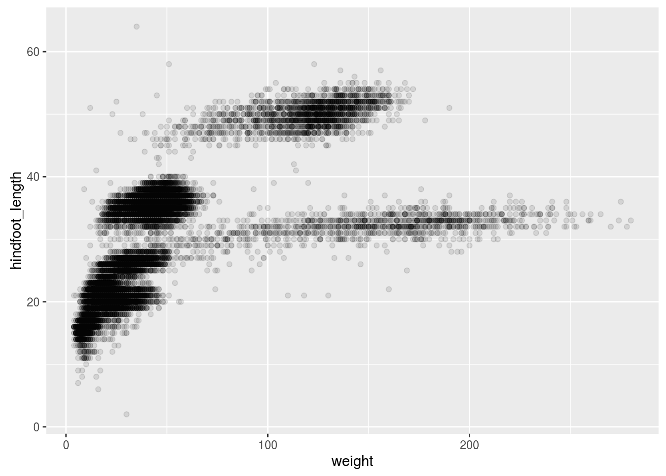 ggplot(data = surveys_complete, aes(x = weight, y = hindfoot_length)) +
