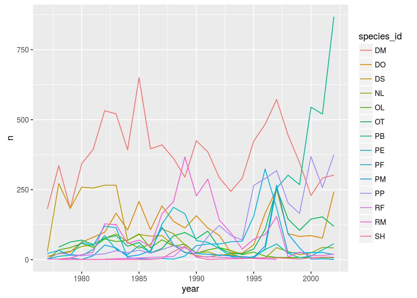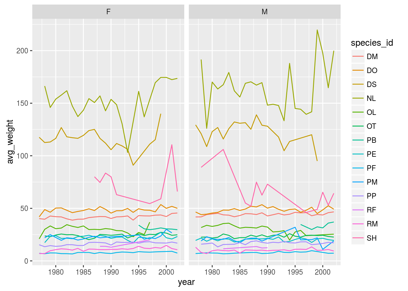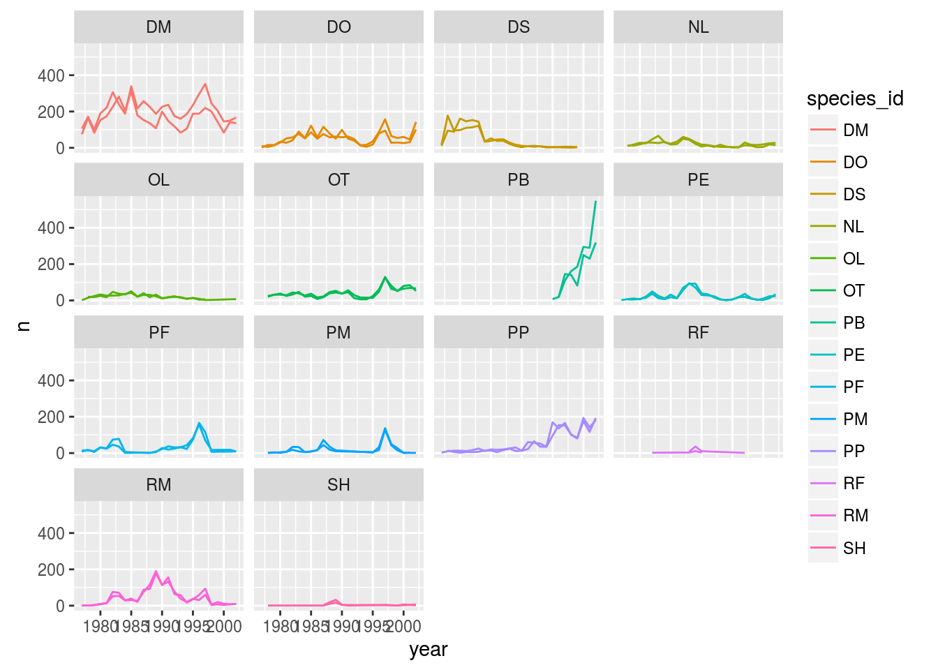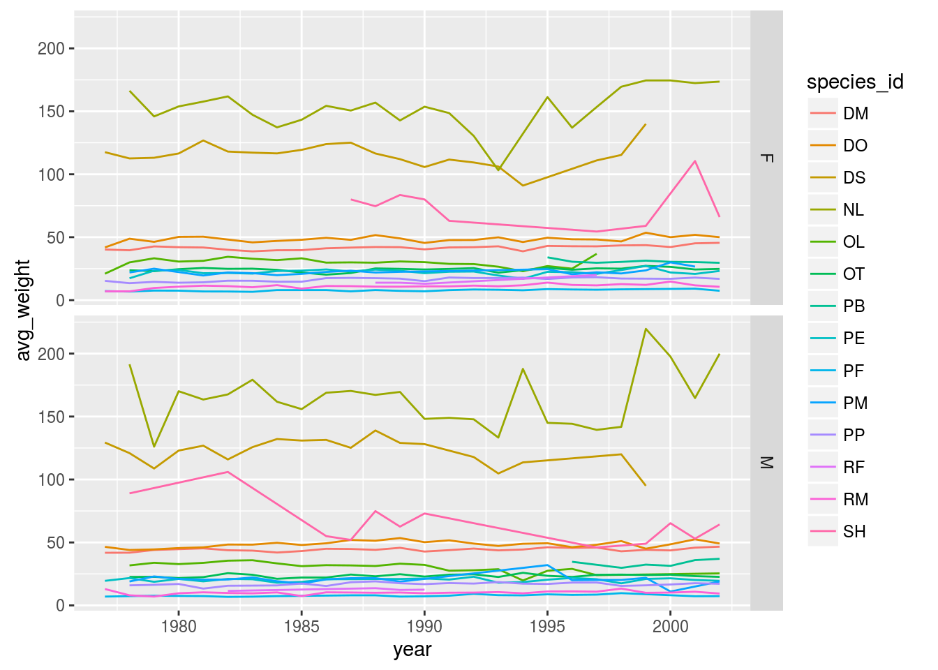 Now we would like to split line in each plot by sex of each individual measured. To do that we need to make counts in data frame grouped by year, species_id, and sex: