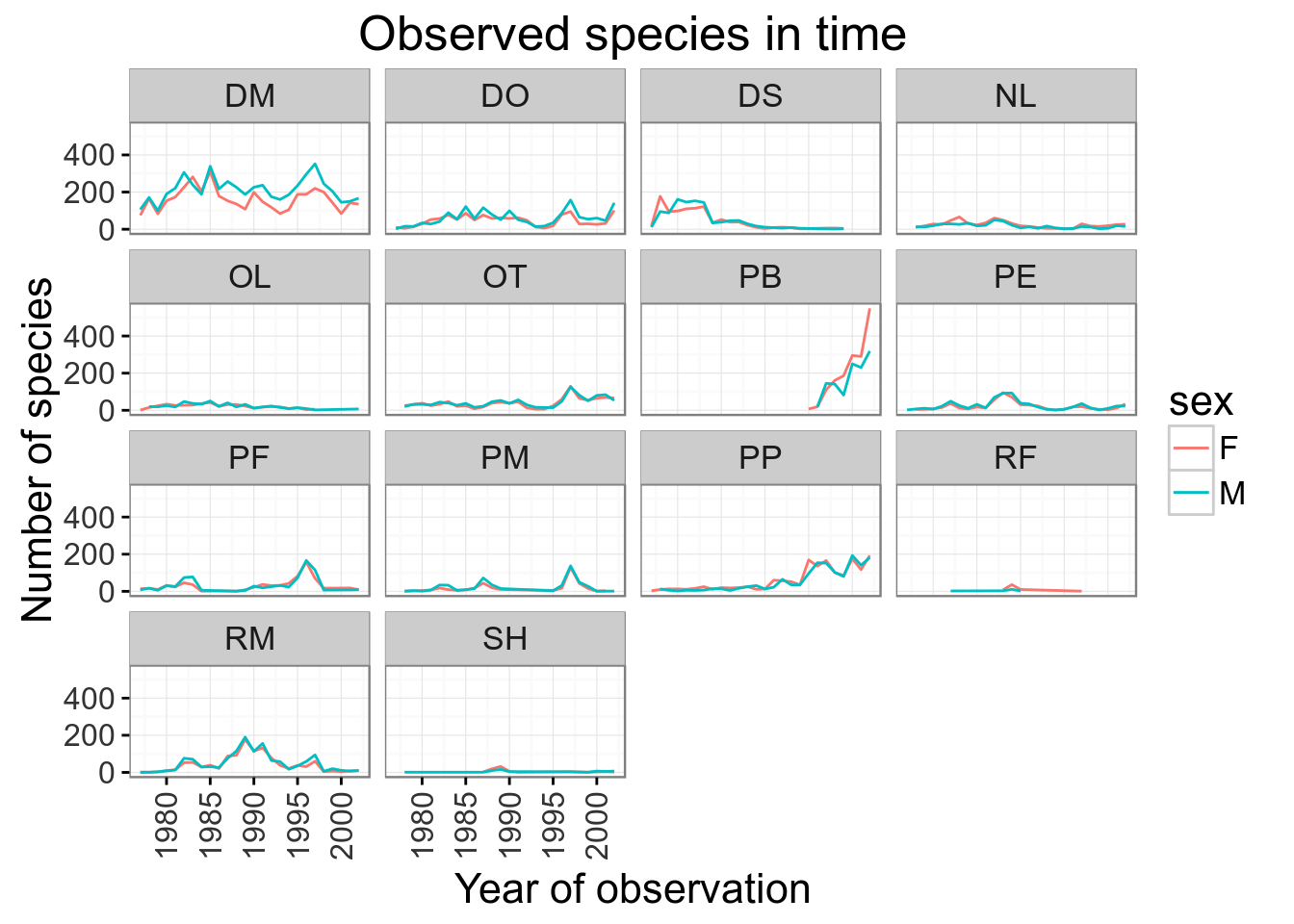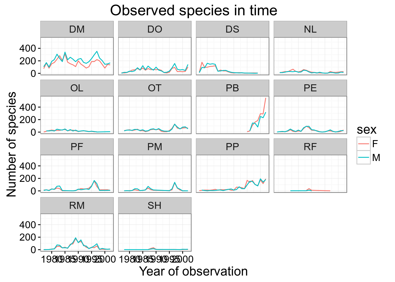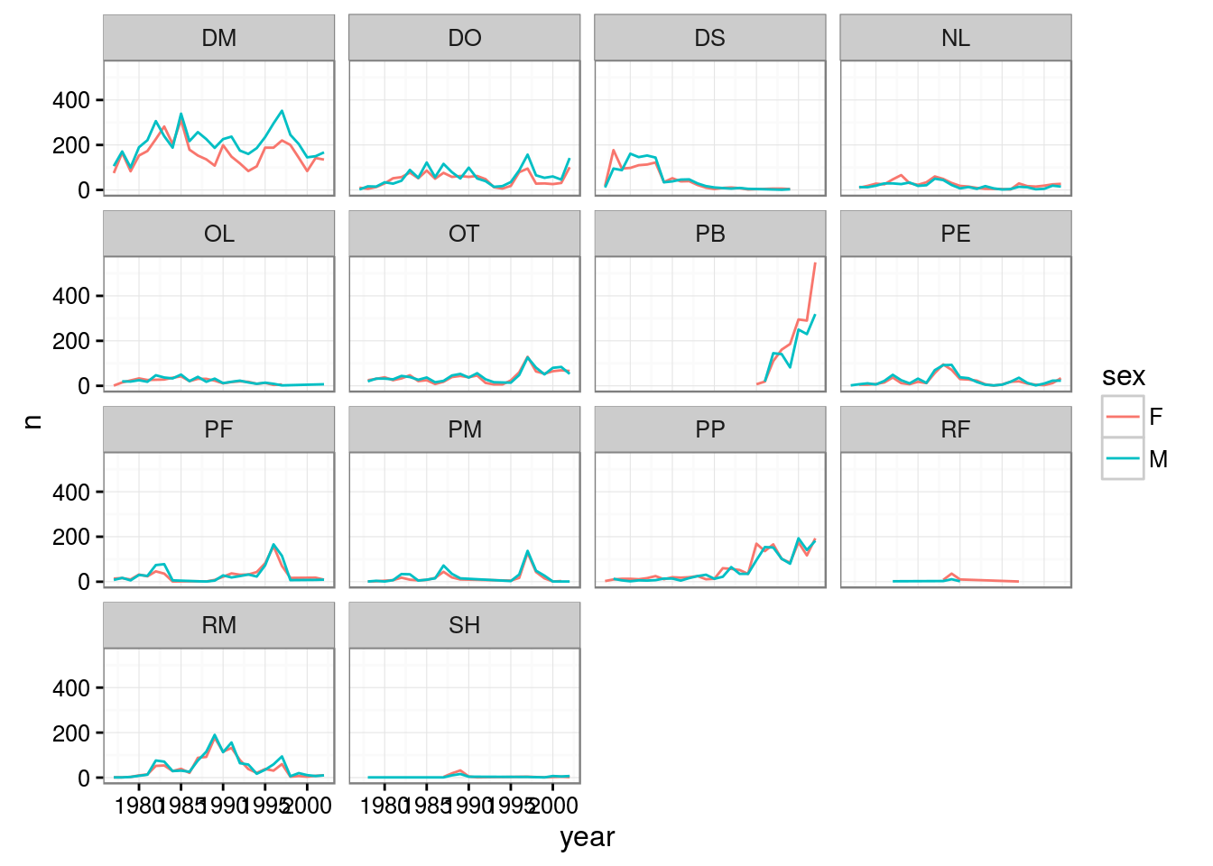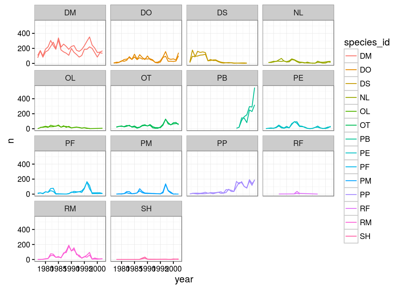 Now we would like to split line in each plot by sex of each individual measured. To do that we need to make counts in data frame grouped by year, species_id, and sex: