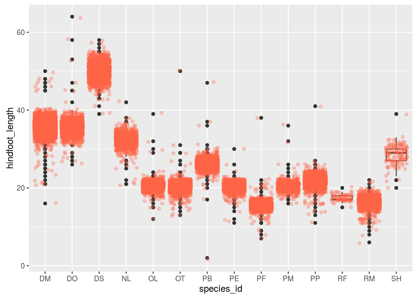 Notice how the boxplot layer is behind the jitter layer? What do you need to change in the code to put the boxplot in front of the points such that it’s not hidden.