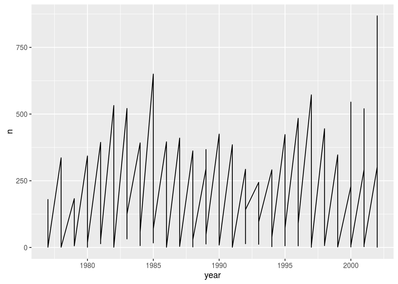 ggplot(data = yearly_counts, aes(x = year, y = n, group = species_id)) +