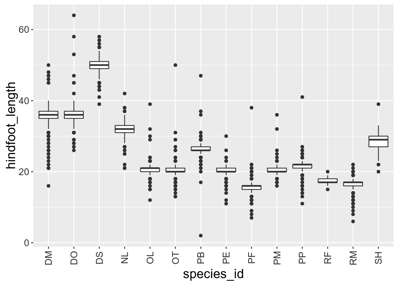 ggplot(surveys_complete, aes(x = species_id, y = hindfoot_length)) +
